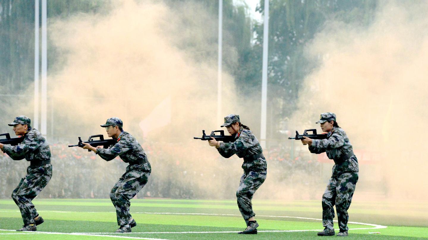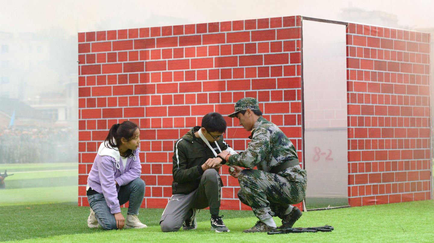 分列式结束后,军训教官和学生进行了匕首操、花样队列、五步拳、擒敌术、反恐演练等汇报表演。女兵们表演的匕首操干净利落、整齐划一,将“巾帼不让须眉”之势展现的淋漓尽致;花样队列表演中同学们摆出“商院2020”“不忘初心、牢记使命”等字样,展现了商院学子勇担时代使命的志向决心;五步拳表演套路连贯、气势如虹,拳脚虎虎生威,擒敌术表演配合默契、果敢勇猛,尽显军人本色;反恐演练与战地救护,模拟展示了多种反恐战术队形、战术手语、战术基本持枪动作以及相对应的实战技能,将现场气氛推向高潮,引得师生阵阵掌声。