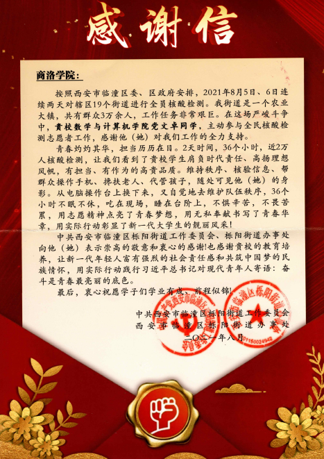 近日,中共西安市临潼区栎阳街道工作委员会、街道办事处向best365发来感谢信。信中热情赞扬了best365学生党文卓在栎阳街道全民核酸检测志愿服务工作中所作出的贡献,同时对best365教育培养优秀学生表示诚挚感谢。