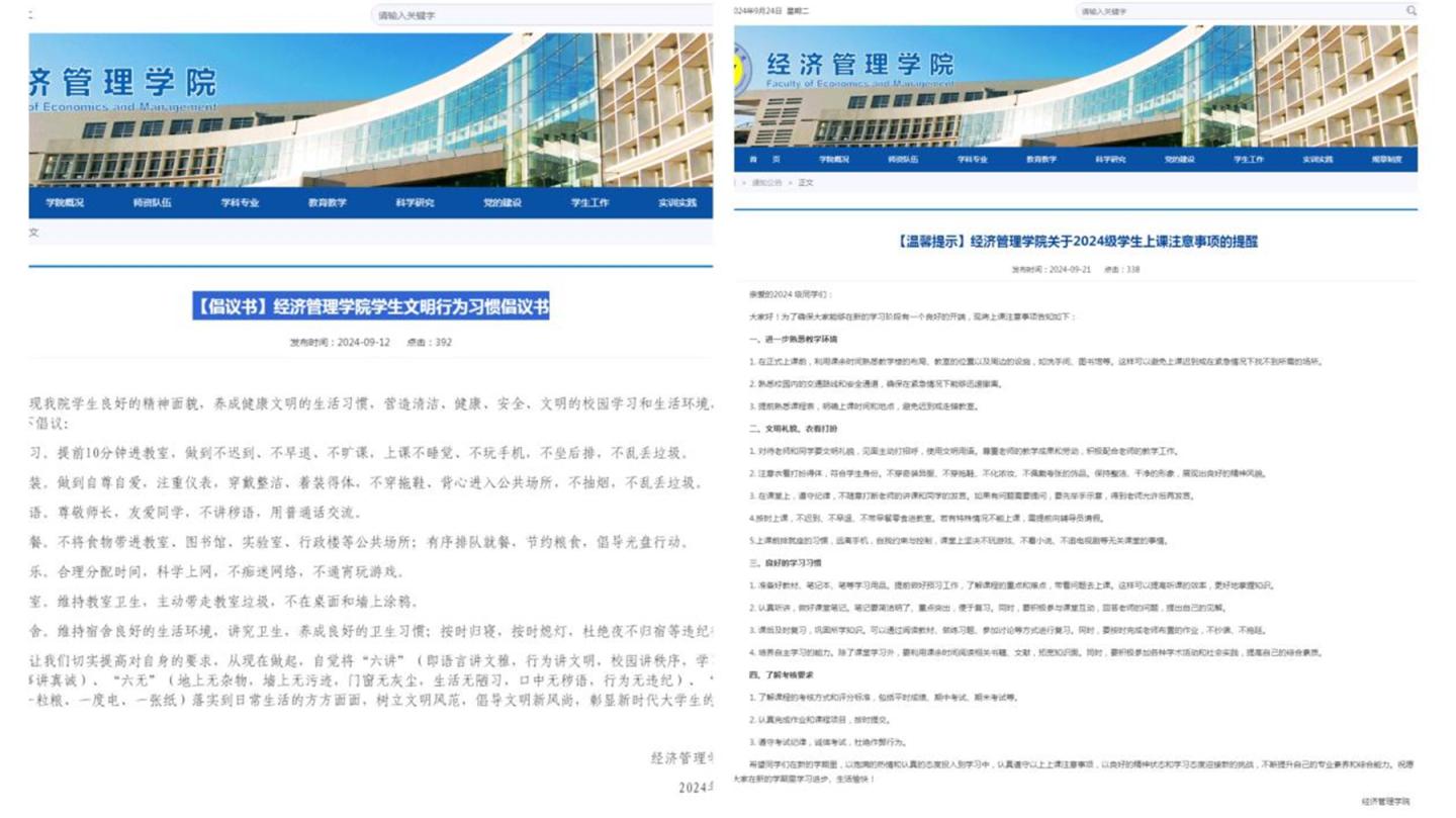 活动开展以来,各二级学院高度重视、积极响应,充分对照学校大学生文明行为习惯养成教育整体安排与具体要求,成立工作专班,组织主题班会,逐班逐人学习《高等学校学生行为准则》《best365中国官方网站大学生文明行为准则(试行)》。此外,各二级学院还结合学院特色与学生特点,组织开展了文明行为养成教育“大讨论”,制定了本学院大学生文明行为十项准则、文明行为习惯养成教育倡议书,推出了文明宿舍创建、文明教室美化、课堂“手机入袋”等一系列主题教育,在全校营造“人人讲文明,处处显文明”的良好氛围。