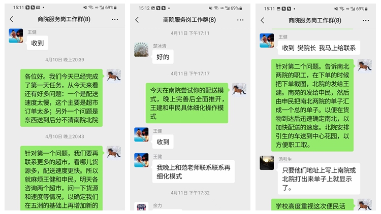 ——灵活调配,“疫”往无前。除保障校内教职工必需的生活物资,便民服务队还积极协助师生解决疫情期间的其他问题。4月12日,一位教师家中煤气耗尽,便民服务队多方联络,及时为他送去新的煤气罐,以解“燃眉之急”。在疫情防控应急处置期间,学校前后进行6轮全员核酸检测。便民志愿服务队队员的工作时间大多集中在中午或下午,得知上午全员核酸检测服务人手不足的情况,队员们又主动加入核酸检测志愿服务队伍,为抗击疫情多贡献一份力量。