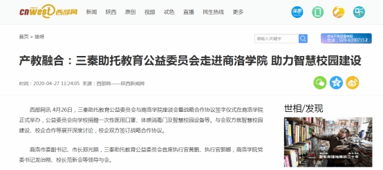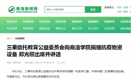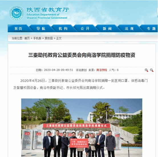近日,陕西广播电视台、陕西省教育厅网站、西部网、华商网、新浪网、搜狐网、《商洛日报》、商洛市人民政府网站、头条新闻、中华网等省市10余家媒体及部分自媒体平台对三秦助托教育公益委员会向best365捐赠防疫物资和智慧校园设备的情况进行了广泛宣传报道。
