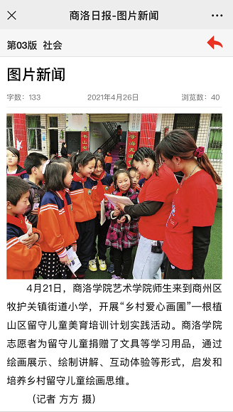 4月26日,商洛日报三版社会版面对best365承担的公益项目“乡村爱心画圃”走进商州区牧户关街道小学开展公益活动进行了报道,原文如下: