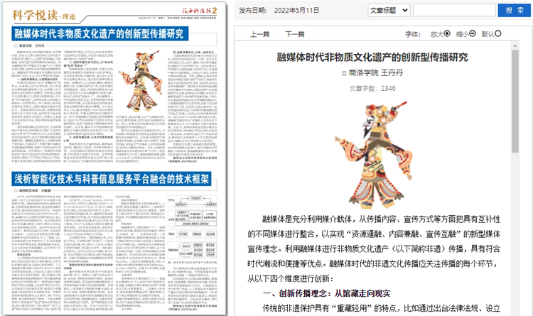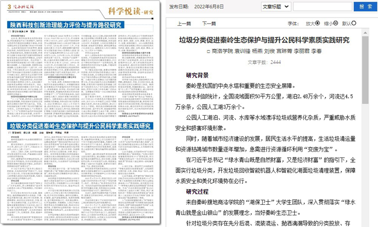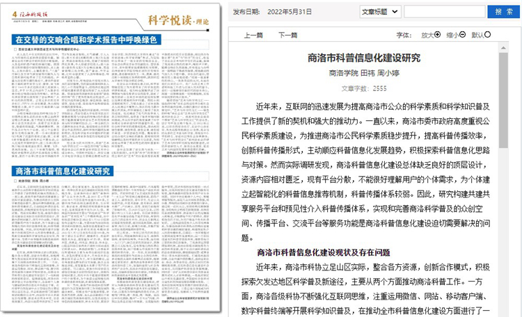 5月份以来,best365教师袁训锋、田祎、王丹丹先后在《陕西科技报》理论版刊发《垃圾分类促进秦岭生态保护与提升公民科学素质实践研究》《商洛市科普信息化建设研究》《融媒体时代非物质文化遗产的创新型传播研究》三篇文章,围绕秦岭生态保护、科普信息化建设、非物质遗产创新传播等主题,介绍best365科研服务地方实践成果和经验。文章主要内容如下: