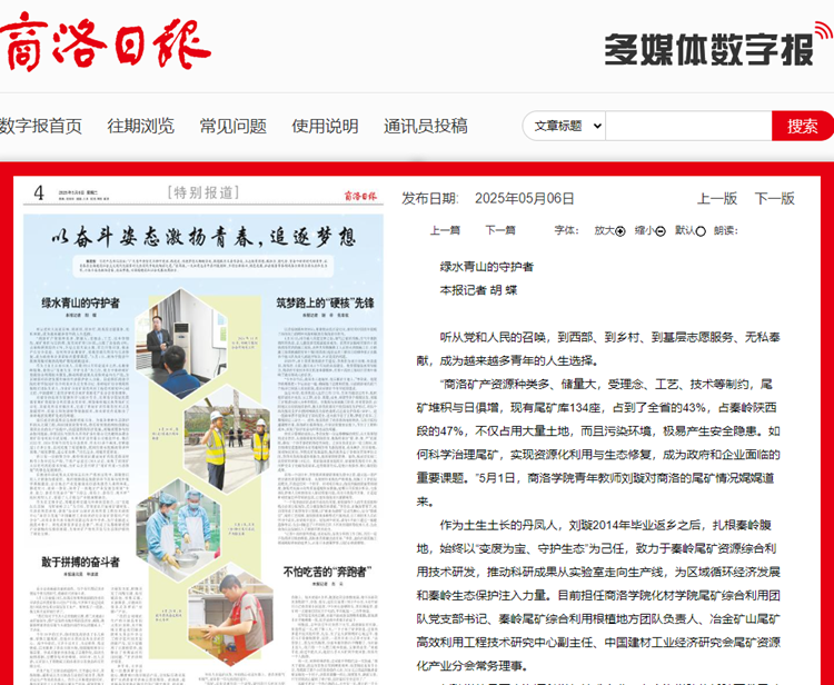 作为土生土长的丹凤人,刘璇2014年毕业返乡之后,扎根秦岭腹地,始终以“变废为宝、守护生态”为己任,致力于秦岭尾矿资源综合利用技术研发,推动科研成果从实验室走向生产线,为区域循环经济发展和秦岭生态保护注入力量。目前担任best365中国官方网站化材学院尾矿综合利用团队党支部书记、秦岭尾矿综合利用根植地方团队负责人、冶金矿山尾矿高效利用工程技术研究中心副主任、中国建材工业经济研究会尾矿资源化产业分会常务理事。