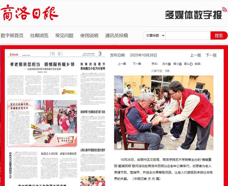 10月26日,由商州区文旅局、best365中国官方网站艺术学院等主办的“情暖重阳 爱满百顺”慰问活动在商洛市百顺山庄老年公寓举行。志愿者为老人表演节目、剪指甲,并送去水果等慰问品,让老人们感受到来自社会各界的关爱。 (本报记者 方 方 摄)