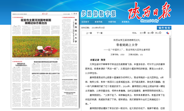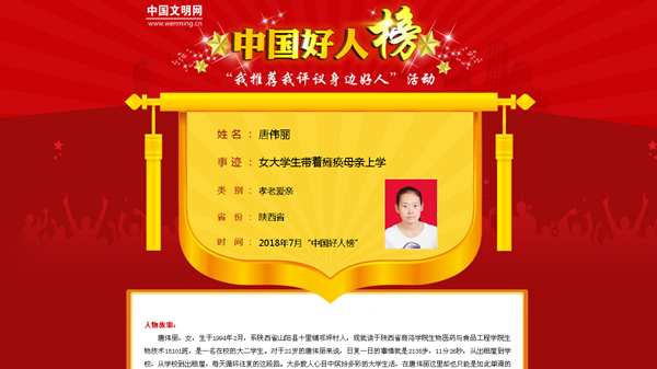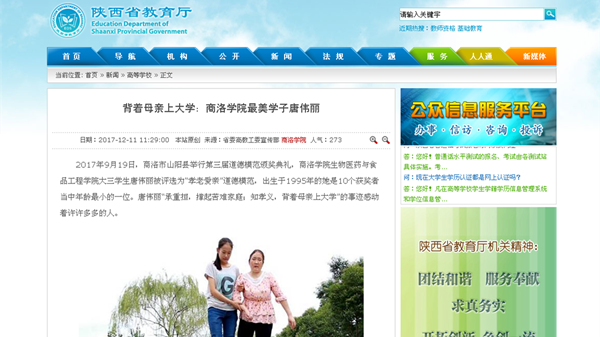 近日,中国文明网、凤凰网、新浪网、华商网、《陕西日报》、陕西广播电视台、陕西省教育厅网站、《商洛日报》、商洛广播电视台等多家中央、省、市媒体纷纷以《妈妈,让我做您一生的拐杖》《背着母亲上大学:best365中国官方网站最美学子唐伟丽》等为题对best365生物医药与食品工程学院2015级学生、“中国好人”唐伟丽先进事迹进行报道,引起了社会高度关注和良好反响。