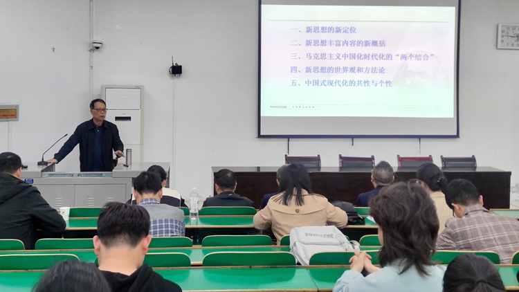阎树群教授以《党的二十大的重大理论创新》为题,紧密结合新思想的新定位、新思想丰富内容的新概括、马克思主义中国化时代化的“两个结合”、新思想的世界观和方法论、中国式现代化的共性和个性等五个方面,逐层展开,对党的二十大的重大理论创新成果进行了引经据典、深入浅出地讲解。他强调,要深入理解习近平新时代中国特色社会主义思想的核心内涵,坚持读原著、学原文、悟原理,持续推进马克思主义基本原理同中国具体实际相结合、同中华优秀传统文化相结合,准确把握中国式现代化本质要求的深刻内涵,奋力谱写全面建设社会主义现代化国家新篇章。