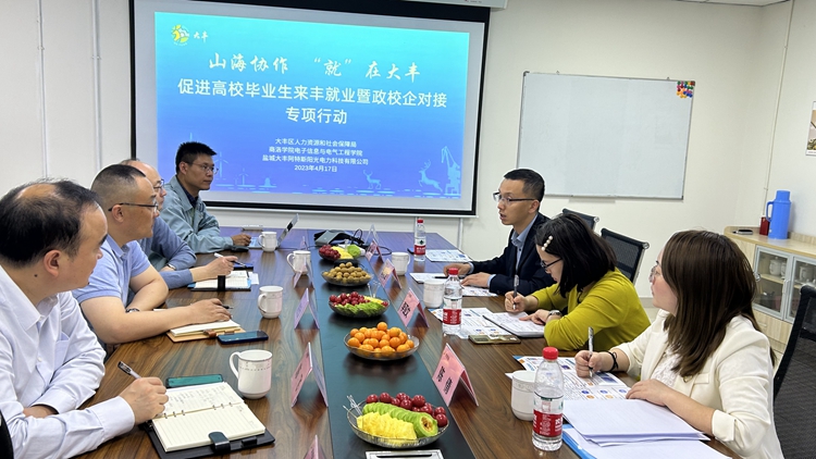 赵永平一行与盐城大丰区人社局及盐城大丰阿特斯阳光电力科技有公司相关领导进行座谈交流。大丰区人社局副局长刘加东介绍了该区相关情况及引进高校毕业生的相关政策,阿特斯总经理兼集团质量部总监蒲云飞详细介绍了企业发展前景、专业需求、毕业生入职培养发展、晋升机制等方面情况。