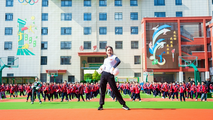 活动现场,体育教学研究部教师张馨娇指导商州区第二小学学生及体育教师大课间花球啦啦操项目《刨冰进行曲》。现场气氛活跃,第二小学师生积极认真的模仿练习,充分展现出少年儿童的蓬勃朝气和健康向上的团队合作精神。