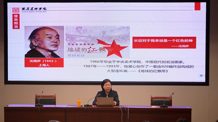 沈宝莲教授主要围绕红色美术资源是优质育人资源、将红色美术资源融入思政课教学的思考与实践两个部分展开报告,讲解过程中对多幅具体生动的美术作品进行解读,并结合丰富的教学经验分享了个人体会。沈宝莲指出,红色美术资源具有鲜明的意识形态性和强烈的艺术感染力,生动地展现了党的百年历史,承载着伟大的民族精神,彰显了艺术家的责任担当和理想追求。在推动思政课教学创新的过程中,要注重将“思政+美术”紧密结合,充分发挥红色美术资源的育人价值,强化课程讲解的直观性、生动性、形象性和可视性,增强学生的课堂参与感和获得感。