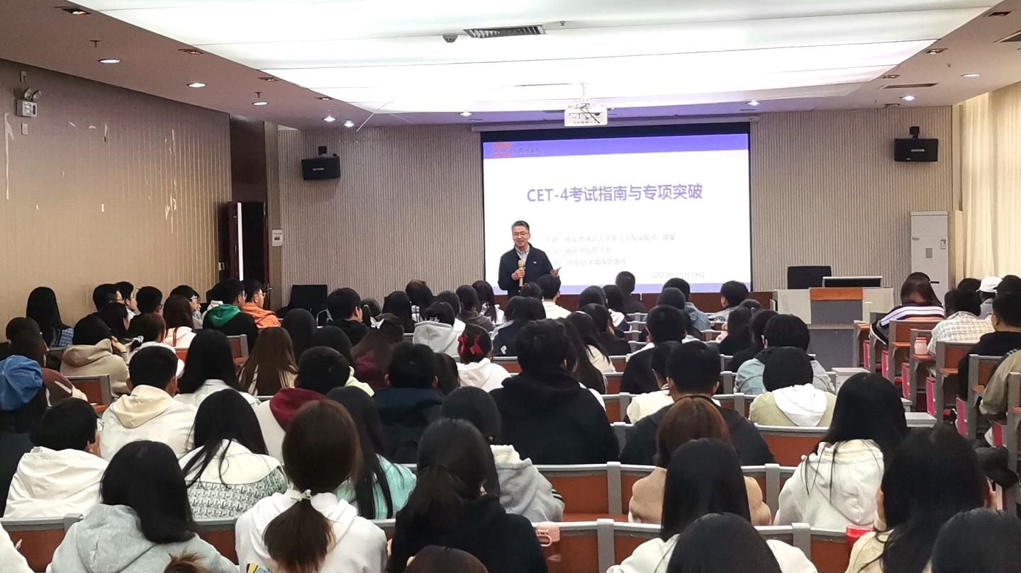 为深化学生对大学英语四级考试认识,提高备考策略与方法,树立考试信心,10月18日下午,图书馆在丹江校区举办“CET-4考试指南与专项突破”专题讲座。讲座邀请西安外国语大学英文学院副院长徐斌作为主讲。各二级学院备考学生近200人参加讲座。