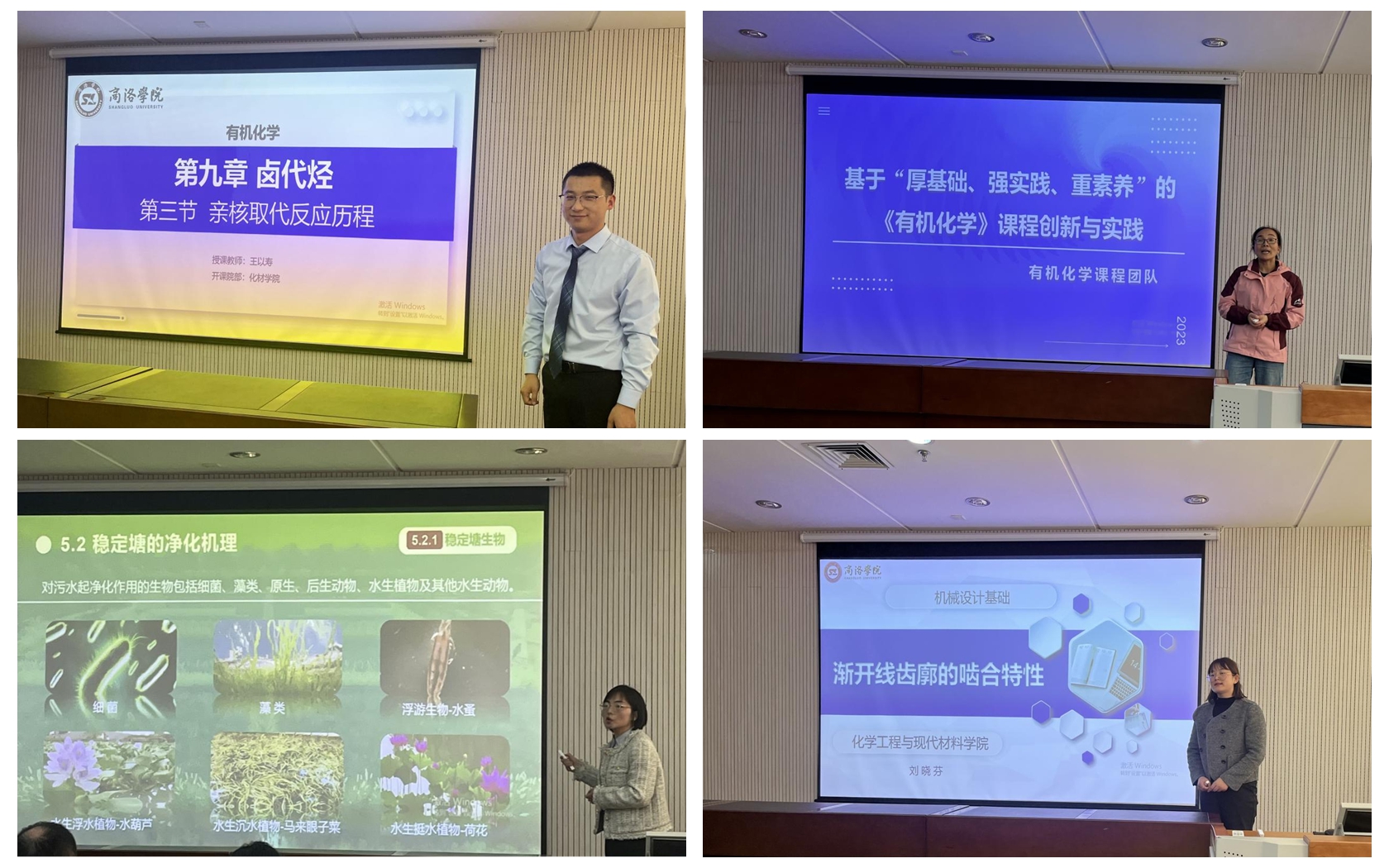 best365中国官方网站青年教师教学技能竞赛一等奖获得者徐珊、best365中国官方网站课程思政教学标兵刘晓芬、best365中国官方网站课堂教学创新大赛一等奖王香婷、best365中国官方网站青年教师教学技能竞赛二等奖、课程思政教学骨干王以寿分别以《基于“厚基础、强实践、重素养”的<有机化学>课程创新与实践》《稳定化塘——净化机理》《渐开线齿廓的啮合特性》《亲核取代反应历程》为题作了示范课讲授,并分享了自身教学技巧和教学设计经验。