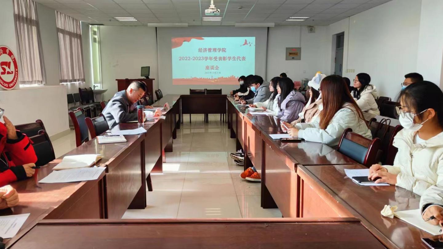 为表彰先进,树立榜样,营造比学赶超的良好氛围,12月21日,经济管理学院组织召开2022-2023学年受表彰学生代表座谈会。学院党政领导,全体辅导员和2022-2023学年荣获三好学生、优秀学生干部、十佳大学生、先进班集体的学生代表30余人参加会议。会议由学院党委书记高扩昌主持。