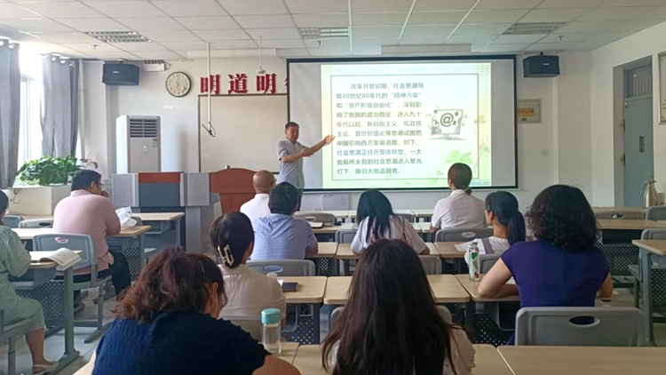 袁祖社教授以《明体达用体用贯通——习近平文化思想的理论精髓、精神实质与实践品格》为题,紧密围绕从中西比较观照的视野看“何谓文化”以及“文化何为”、全球化新阶段我国文化建设面临的关键性挑战与重要使命、习近平文化思想的理论品格、民族精神独立性与文化主体性自觉、习近平文化思想的理论创新、精神实质及方法论启示等方面展开精彩的讲解。以《当代中国主要社会思潮:缘起背景、表征样态、渗透逻辑与应对方略》为题,从社会思潮的核心内涵及其基本特征、当代中国社会思潮的形成及其演变阶段、客观认识和理智应对社会思潮的有效方略等三个方面展开讲解。