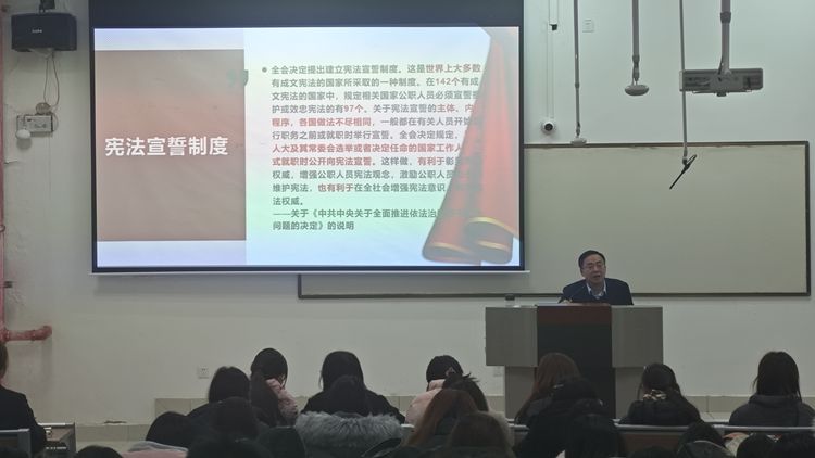 陈波从新中国成立后不同时期宪法的制定与实施、现行宪法的颁布实施及五次修改、现行宪法的主要内容等方面入手,为学生讲解了“为什么要学习宪法”“宪法的精神是什么”“如何提高法治思维”三个方面的问题。通过案例与法律条文相结合、深入浅出的讲述方式,使学生深刻理解了我国宪法的地位、作用和基本原则,掌握了我国宪法精神的内涵,使学生对我国宪法有了全面系统的学习与了解,激发了学生学习宪法、维护宪法、弘扬宪法精神的热情与决心。