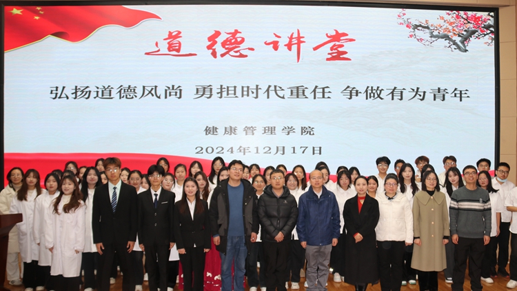 为讲好身边故事,激励青年学子陶冶道德情操、弘扬正气、开阔视野,提升品德修养,营造“积小德为大德,积小善为大善”的良好风气,12月17日下午,健康管理学院在图书馆二楼报告厅举办了“弘扬道德风尚 勇担时代重任 争做有为青年”道德讲堂活动。院党委书记王攀、各系主任、全体辅导员及400余名在校学生参与活动。