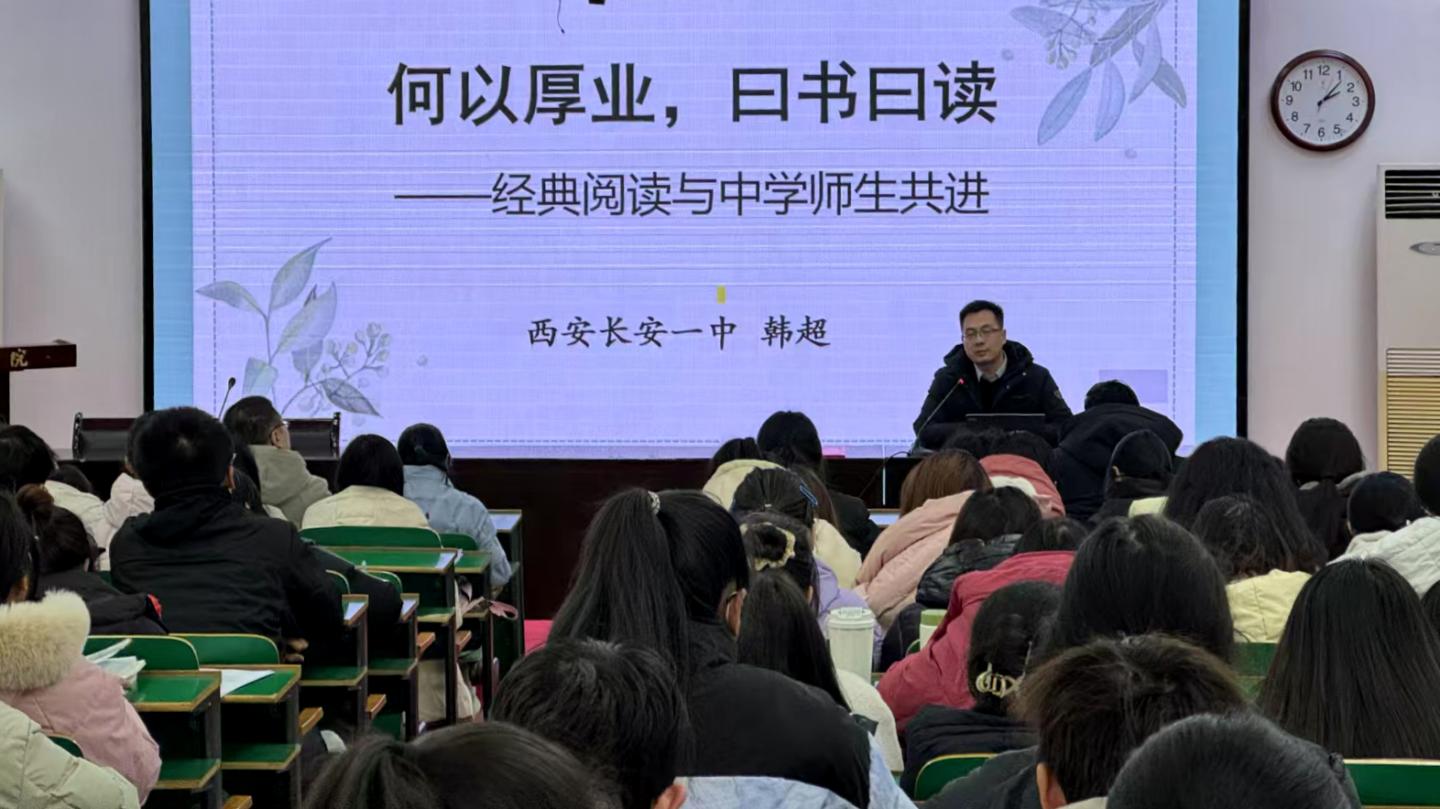 为进一步提升师范生专业素养,打造落地性更强的实践学习平台,12月26日下午,人文学院邀请陕西省优秀教师、中学语文高级教师、长安一中副校长韩超担任主讲嘉宾,为师生作实践教学“经典研读”专题报告。人文学院院长张文诺为韩超老师颁发汉语言文学专业授课专家聘书,副院长张建军、学院教师代表和2023级汉语言文学专业全体学生参加报告会。