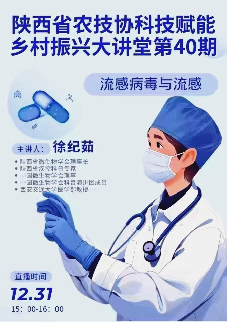此次直播课是“陕西省农技协科技赋能乡村振兴大讲堂”的第40期,由陕西省科学技术协会主办,陕西省微生物学会等3家单位承办。直播课上,徐教授用通俗易懂的语言,生动讲解了流感病毒的病原生物学特点、类型、传染性和抵抗力等健康知识,以生活案例为切入点详细阐释了流感的临床表现、病原、高发季节、传播途径、致病致死率、潜伏期、流行史等内容,告诉大家发热不适时如何自我判断、如何正确用药就医,引导大家通过及时接种疫苗、科学佩戴口罩、保障充足睡眠、远离密集场所、加强运动锻炼等方式预防流感。