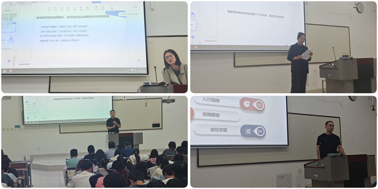 分享会上,韩杏结合自身成长及担任搜狐畅游高级项目经理的相关经历,围绕“职业规划的锚点与动态调整”展开分享,她强调职业规划并非一成不变的“死计划”,而要在实践中根据自身优势与行业趋势灵活调整。孟丹梅带来了“专业学习与学历提升的双向赋能”主题分享,她介绍了自己考取广西大学硕士研究生的备考经验及在联想集团、国网商洛供电公司的工作历程,建议大家尽早明确目标,做好职业规划。史晓东则以“从校园到名企:实习与就业的探索之路”为主题,分享了自己在小米公司、中国联通商洛市分公司的职业经历。强调实习是大学生接触职场的重要窗口,建议学弟学妹们在校期间积极争取优质实习机会,提前了解行业动态。在三位校友分享后,搜狐HR张恒从企业招聘视角,解读“互联网行业人才需求与能力要求”。他建议学生在校期间,通过参加学科竞赛、社团项目、科研实践等方式,全方位锻炼自己。