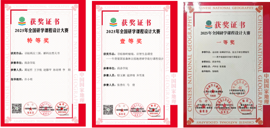2025 年5月,在“九州杯”全国研学课程设计大赛中,地理专业许小明教师指导的地理科学专业团队(冀延哲、王宇航、赵滕甲、孙诗博、李阳)表现突出 ,团队共同完成的《走进两汉三国,解码自然天书》的研学课程设计,从 2000 多项参赛作品中脱颖而出,一举夺得成果组特等奖。