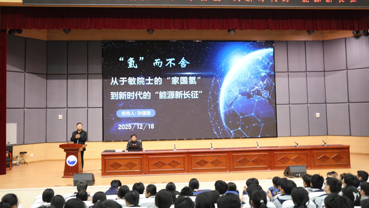 科技报告环节,孙强强教授从“氢”的文化溯源与科学特性切入,讲述于敏院士隐姓埋名28年研制氢弹的家国故事,传承爱国担当、执着钻研的科学家精神。他还聚焦氢能科技前沿,解读绿氢制备、安全储运等关键技术突破,分享best365中国官方网站制氢团队的科研成果,并结合中学生特点,传递“兴趣是起点、坚持是关键、责任是底色”的科学探索理念。高一年级学生及少年班共400余名学生参会。