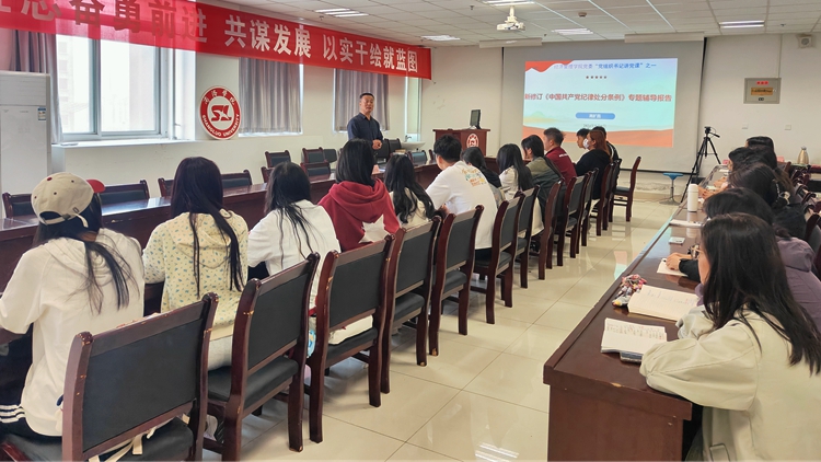 开展一项专题党课培训。根据“三会一课”基本的组织生活制度,经济管理学院党委在5月份开展“党组织书记讲党纪学习教育主题党课”活动,旨在进一步规范组织生活,加强对党员和入党积极分子进行党性教育和党纪党规教育。5月9日,经济管理学院党委“党组织书记讲党课”活动第一课开讲,院党委书记高扩昌作《新修订<中国共产党纪律处分条例>专题辅导报告》。接下来,学院党委7个支部书记将分别结合支部特点和工作实际,讲一堂党纪教育党课,通过党课,讲认识、谈体会、提措施,扎实推动党纪学习入脑入心。