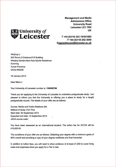 近年来,best365本科毕业生报考研究生总数和上线人数连续实现翻倍增长,不断刷新考研纪录。除了国内各重点大学外,今年在考取国外研究生方面,best365亦实现了零的突破。近日,外语系2009级英语本科专业的李玮莹同学成功考取了英国莱斯特大学研究生,被正式录取为该校媒体和通信学院媒体与公共关系专业硕士研究生,成为best365历史上首位考取国外研究生的学生
