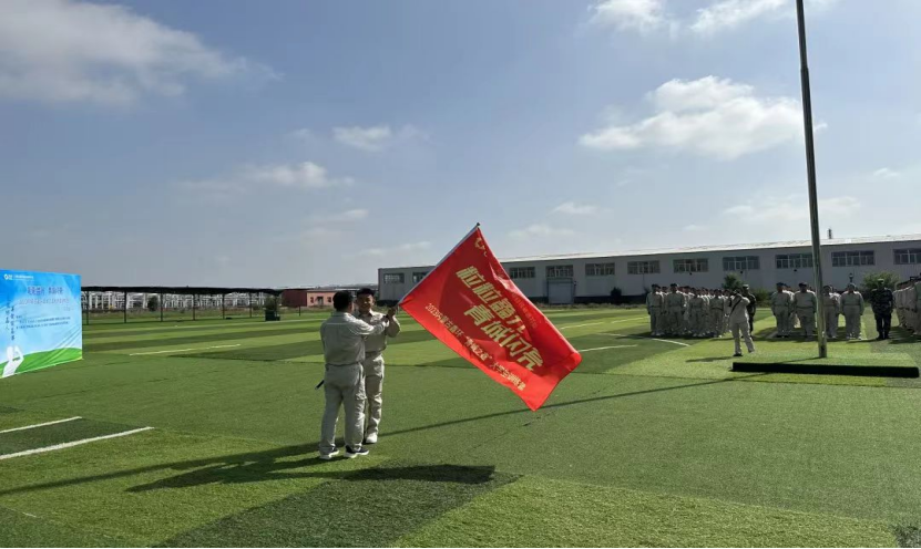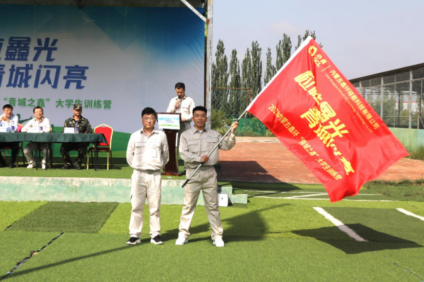 “粒粒鑫光,青城闪亮”大学生训练营授旗仪式环节,陈飞向2023届入职学生代表吴大龙授旗。新入职员工奋力挥舞着代表着梦想起航的红旗,宣告着本次训练营正式拉开帷幕。