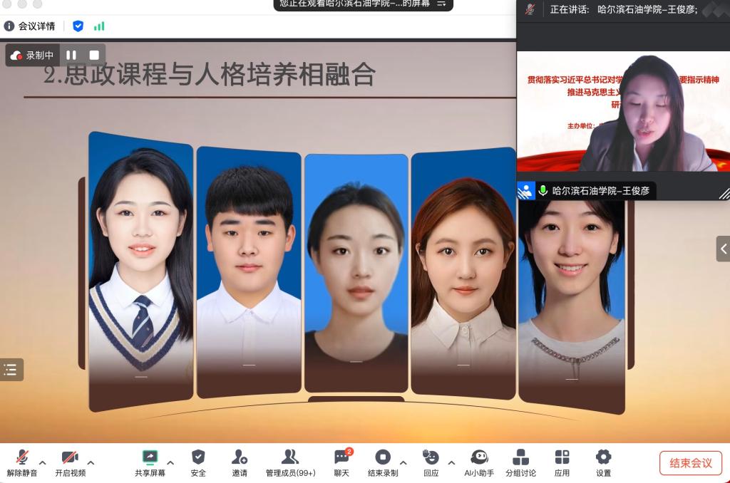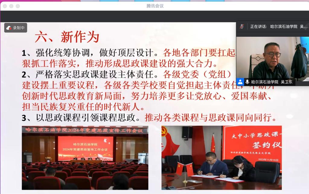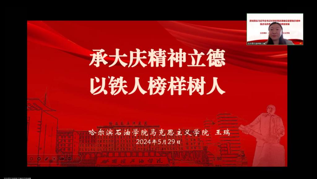 马克思主义学院副院长王瑞以《承大庆精神立德以铁人榜样树人》为题,围绕思政课程教学改革创新、大庆精神铁人精神育人、大中小学思政课一体化建设、思政课程和课程思政深度融合等方面介绍了马克思主义学院建设情况。