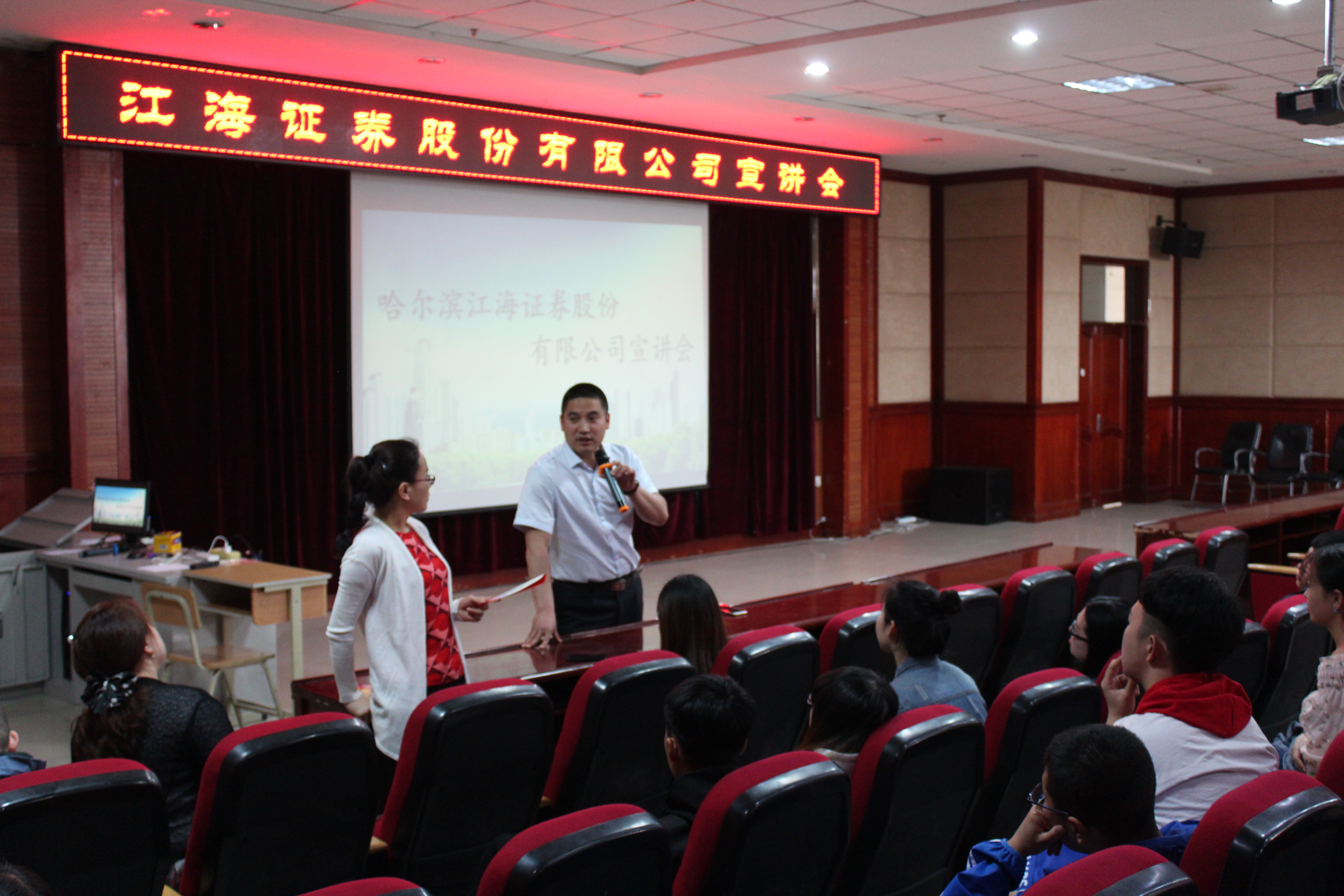 5月5日,经济管理学院携手哈尔滨江海证券股份有限公司在主教518报告厅启动了2017年校园宣讲会。我院党总支书记吴东爽、辅导员郭思骄出席本次会议,2014级全体学生参加会议。