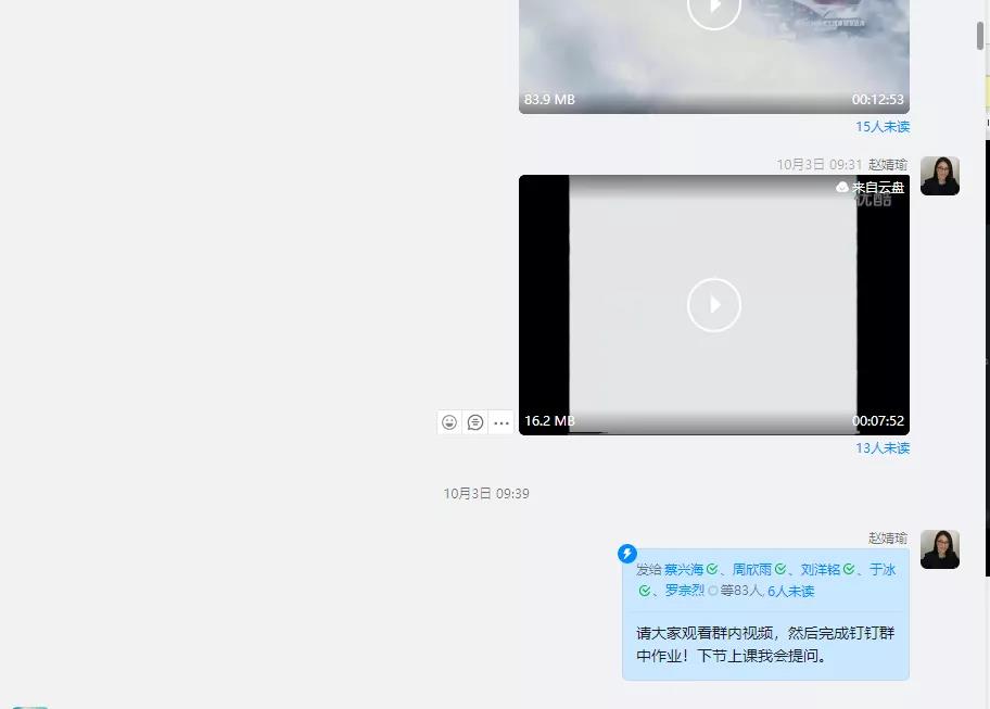 在钉钉群中发布视频,通过钉钉作业功能发布作业。可以详尽掌握每一位同学观看视频情况以及作业完成情况。