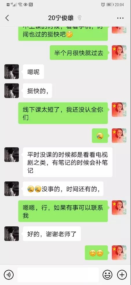 此外在这次疫情中,有个别学生被单独隔离,在上课过程中更要多关注他们,除了课上多提问,课下也尽所能关心他们。得知他们虽然处于隔离中,但是情绪很好,并且通过上课学习记笔记、完成作业很好地度过了隔离期,为师也很欣慰!