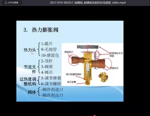 这次的课程全部采用钉钉平台视频会议形式,课前精析教材,精设课件, 精心制作的PPT课件内容丰富,图文并茂,动画生动,通过把制冷装置复杂的部件结构图和工作原理以实物图片、动画的形式展现出来,对流体的流动方向,复杂结构部件的移动,压力、温度等参数的变化表现直观,带入感强。容易让学生理解并且印象深刻,便于强化记忆,收到良好的教学效果。