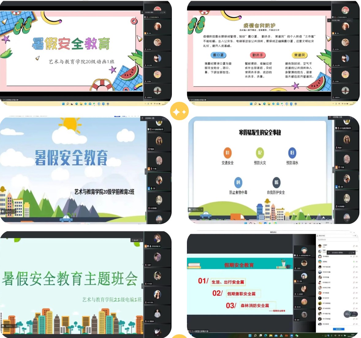 为切实做好暑期学生的安全教育管理工作,预防各类危险事故的发生,营造和谐稳定的安全环境,确保学生度过一个安全、充实的假期。根据金沙检测线路js69学生处下发的《关于召开2022年暑假学生安全教育主题班会的通知》相关要求,艺术与教育学院于2022年6月19日至2022年6月22日组织全体学生以年级班级为单位线上召开暑假安全教育班会。