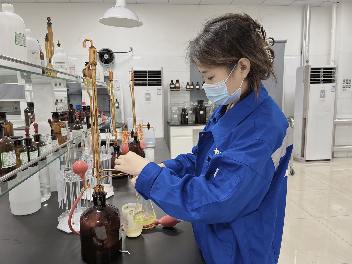 通过实习,我学会了精准滴定,并准确算出数据,对于化学有关专业知识应多学习,多动手实际操作,同时实验室里工作要注意安全,劳保要佩戴整齐,带好护目镜防止药品进入眼睛,做有刺激性气味的实验要戴好口罩、手套。