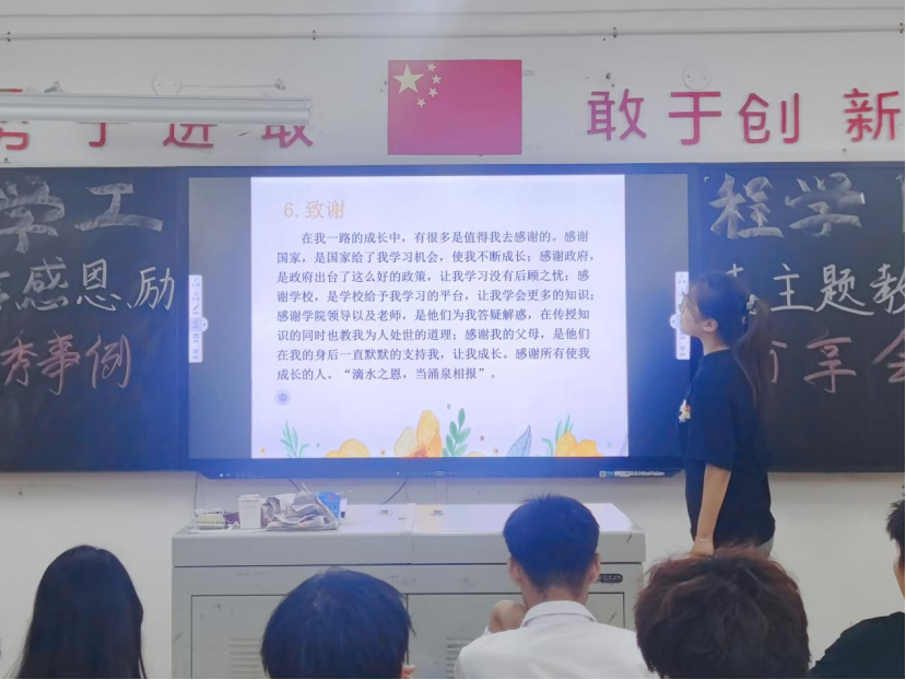 为进一步弘扬诚信文化,倡导诚信行,增强大学生感恩意识,做文明大学生的同时也大力宣传国家学生资助政策,以先进典型的榜样力量感召青年,2023年6月7日19时30分,化学工程学院于第二教学楼309室开展“诚信、感恩、励志”主题教育优秀示例分享会,分享会由我院优秀学子主讲。