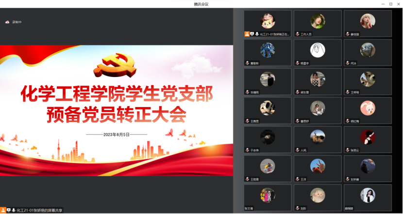 为加强党组织建设,壮大党员队伍,2023年6月5日11时50分,化学工程学院学生党支部召开2023上半年预备党员转正大会,会议以线上线下相结合的方式开展,会议由张娇艳同学主持,学院党总支书记张艳丛、党总支副书记赵婧、学生党支部书记于鑫、2019级辅导员马志强、辅导员王小丽、2020级辅导员助理王喃出席会议,全体学生党员参加会议。