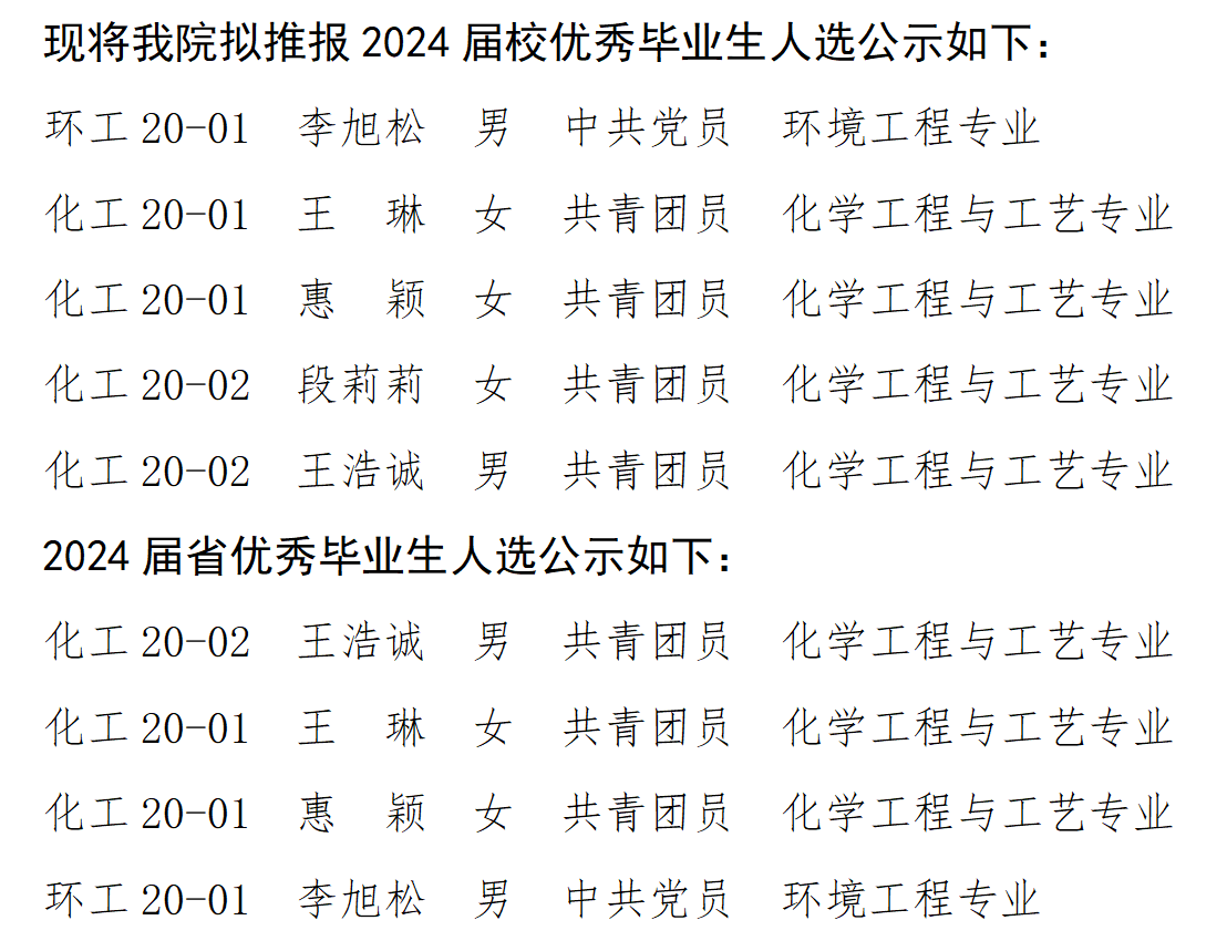 根据《关于评选2024年黑龙江省普通高等学校优秀毕业生及金沙检测线路js692024届优秀毕业生的通知》要求,经学生本人申请、学生本人自评,化学工程学院评审委员会进行复审,化学工程学院党政联席讨论通过,拟推荐王浩诚等4名学生评选黑龙江省普通高等学校“优秀毕业生”;拟推荐李旭松等5名学生评选金沙检测线路js69“优秀毕业生”,公示如下: