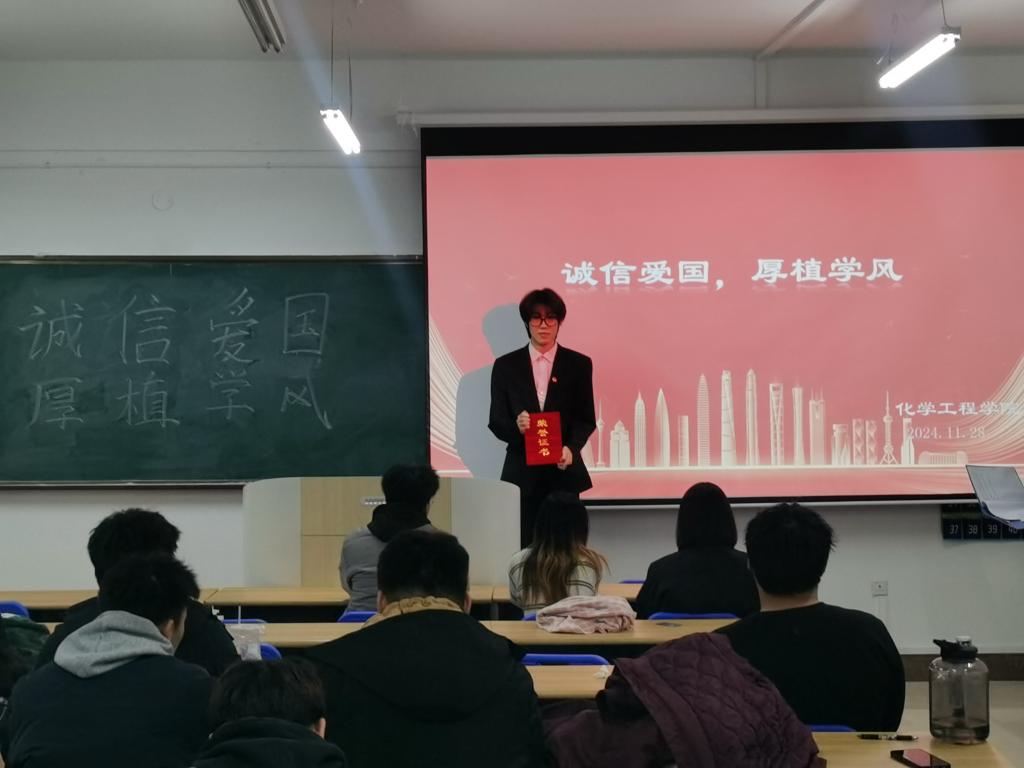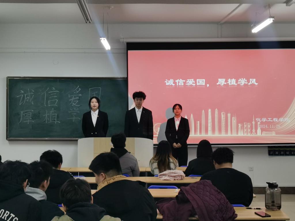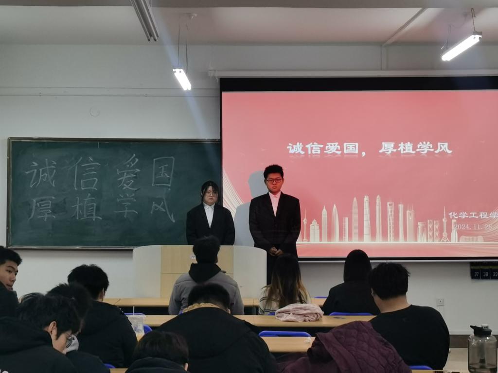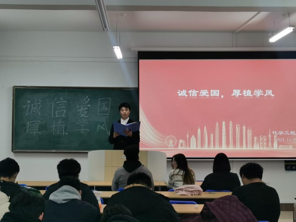 为倡导诚信的价值观念,引导学生养成诚信做人、诚信做事的品质,弘扬诚实守信传统美德,增强当代大学生的诚信意识和责任担当,扎实推进诚信教育,2024年11月28日,化学工程学院于第二教学楼309室开展“诚信爱国,厚植学风”主题演讲比赛,2024级学生代表参与本次活动。
