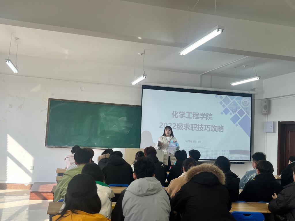 为更好落实学生“3+1”企业综合实习的管理工作,帮助同学们提升求职竞争力,顺利开启实习生涯,2025年3月13日,化学工程学院开展2022级求职技巧攻略主题班会,涵盖从简历制作到面试应对的各个关键环节。学院2022级辅导员于鑫担任主讲人,全体大三学生参与学习。