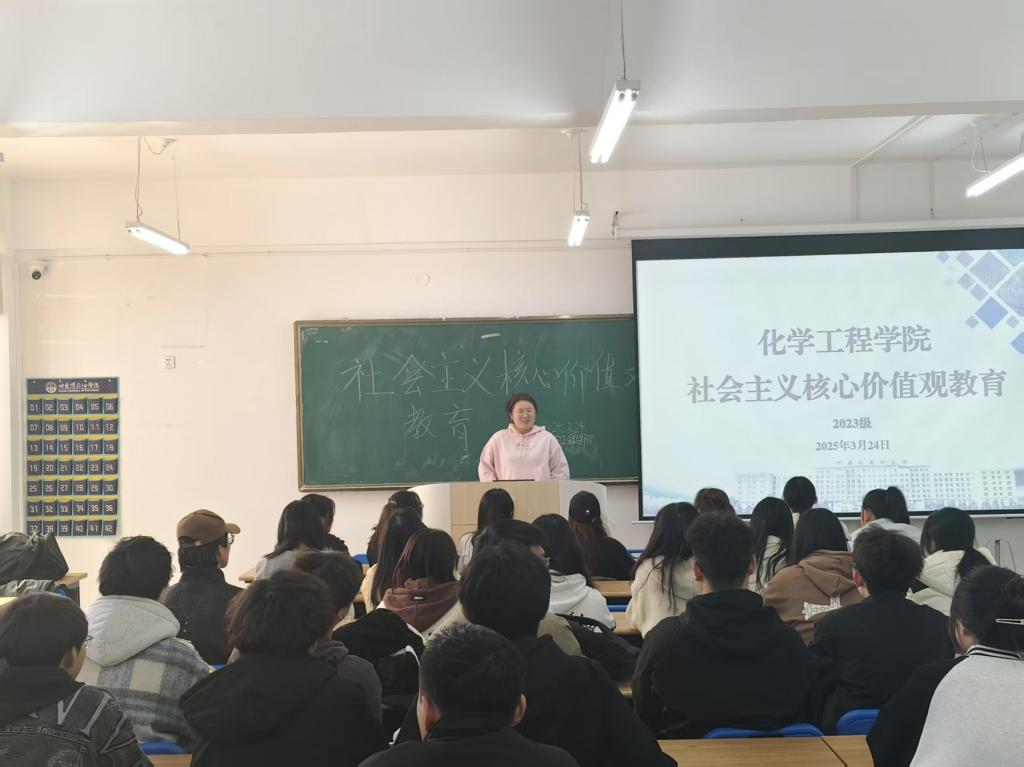 为深入学习贯彻习近平新时代中国特色社会主义思想和党的二十大精神,进一步培育和践行社会主义核心价值观,加强学生思想道德建设,2025年3月24日,化学工程学院组织开展社会主义核心价值观主题班会。会议由2023级辅导员王小丽主持,2023级全体学生积极参加。