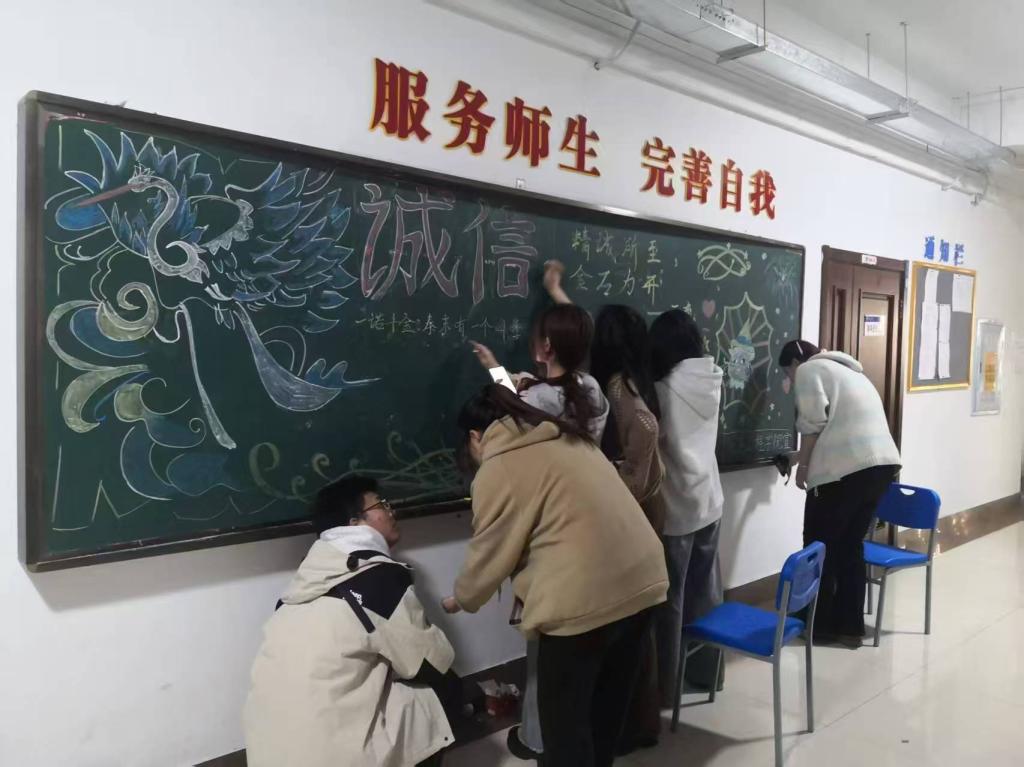 活动现场,同学们围绕 “诚信” 主题,精心绘制了一幅幅精美的黑板报。他们用绚丽的色彩、生动的图案和深刻的文字,诠释着诚信的内涵与价值。有的黑板报以诚信名言为核心,搭配相关的典故插画;有的则结合校园生活中的点滴小事,展现诚信在日常交往和学习中的重要性,引得过往师生纷纷驻足欣赏、称赞。