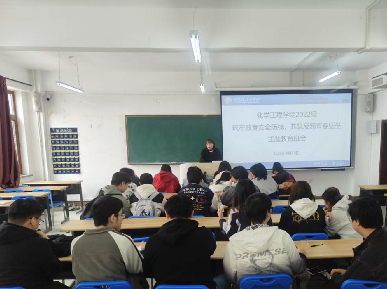 为进一步强化学生总体国家安全观与反邪教意识,营造安全文明的校园环境,2025年4月21至22日,化学工程学院开展“筑牢教育安全防线,共筑反邪青春堡垒”主题教育班会。此次班会由各年级辅导员主持,全体同学积极参与。