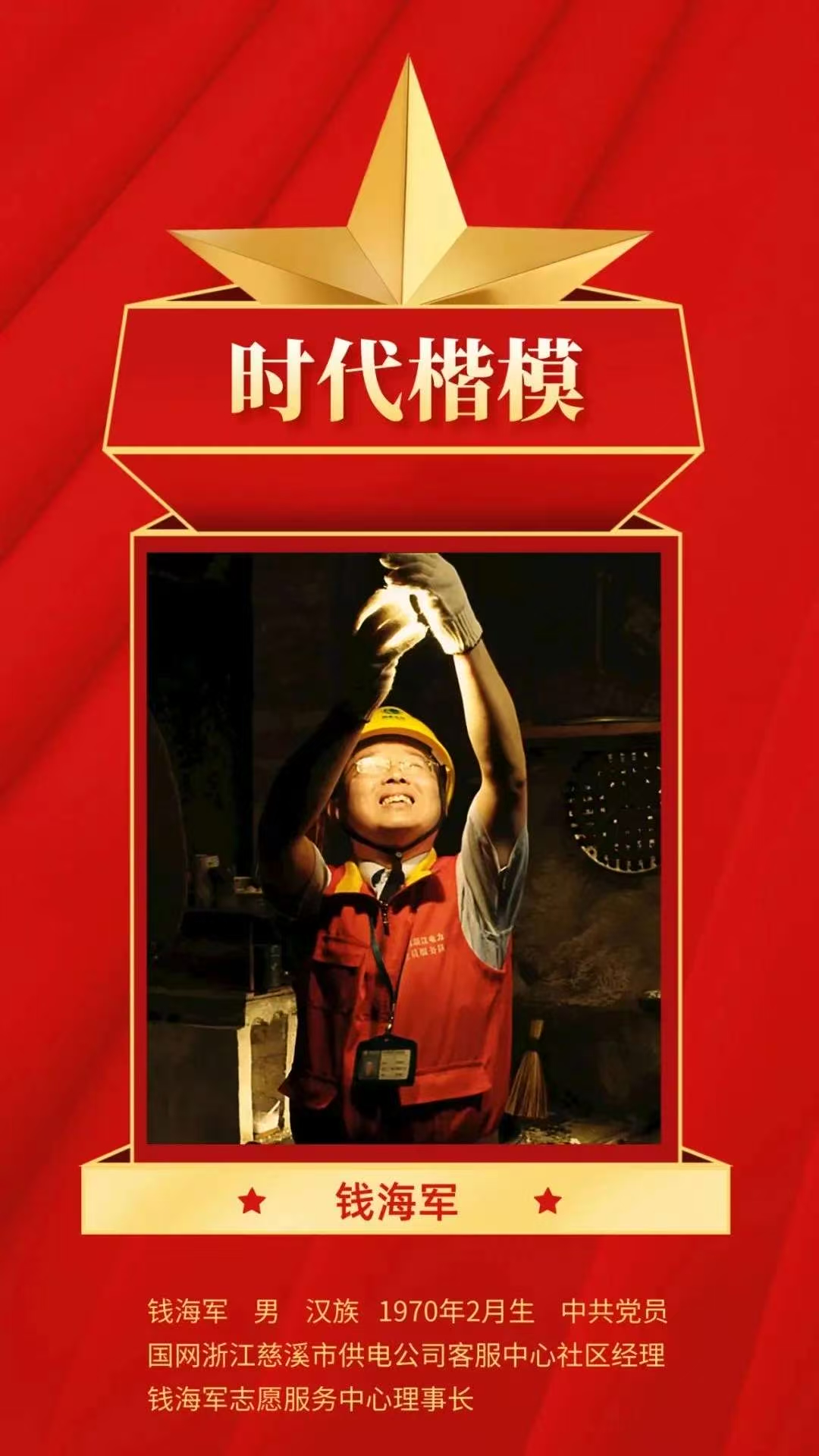 钱海军,男,汉族,1970年2月出生,浙江宁波人,中共党员,国家电网浙江慈溪市供电公司社区客户经理。他扎根基层电力服务一线30余年,以无私奉献的精神和精湛的专业技能,成为群众心中的“点灯人”,被誉为“万能电工”“电力义工”。2022年5月,中共中央宣传部授予钱海军“时代楷模”称号,表彰他全心全意为人民服务的先进事迹。