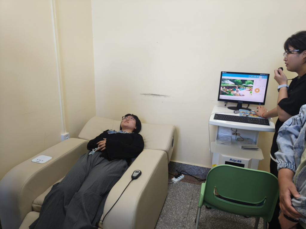 活动中,心理健康教育与咨询中心的老师首先为同学们详细介绍了中心的功能布局,包括沙盘游戏室、音乐辅导室、团体辅导室等不同功能区域的作用,以及专业心理设备的使用方法。在放松训练室,老师现场演示了生物反馈仪、音乐放松椅等设备的操作流程,让新生直观感受心理调节的科学方式;同时老师向同学们讲解沙盘游戏室通过沙具摆放与沙盘创作,能帮助大家直观梳理内心情绪、释放心理压力,是探索自我、调节心态的重要空间。