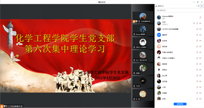 为推进党的十九届六中全会精神宣讲活动持续深入开展,深刻理解领会党的十九届六中全会精神实质和丰富内涵,把学习贯彻全会精神不断引向深入。2022年4月20日,化学工程学院学生党支部开展2022年第六次集中理论学习,52名学生党员参加学习。