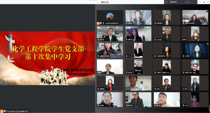 为贯彻落实习近平总书记《论中国共产党历史》重要讲话精神,筑牢学生党史学习之基,持续做好党史学习教育的提升工作,2021年11月10日18时,化学工程学院学生党支部于线上开展第十次集中理论学习。学生党支部书记于鑫和44名学生党员共同参加此次理论学习。