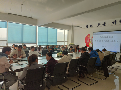 根据《化学工程学院开展本科教育教学思想大讨论实施方案》要求,10月8日下午,学院组织开展本科教育教学思想大讨论第四次集中学习讨论活动,学习活动由副院长彭殿宝主持,院长杨昕、党总支书记赵婧及学院全体教师参加。