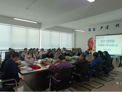 2023年12月29日,化学工程学院组织召开年度工作总结大会,对本年度工作进行总结,并对假期和下学期开学初的工作进行安排和部署。会议由院长杨昕主持,党总支书记徐宏莉、副书记赵婧、副院长彭殿宝及全体教师参加会议。