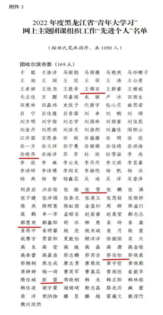 先进个人金沙官网团委书记王锦石、团委副书记彭雷、外国语学院党总支书记孙晓萍、石油工程学院党总支副书记张雪、校团委秘书处秘书长郭佳怡(学生)、化学工程学院团总支副书记郝慧爽(学生)荣获2022年度黑龙江省“青年大学习”网上主题团课组织工作“先进个人”荣誉称号 。